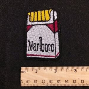 Distinctive Marlboro patch. Features bold red and yellow on a black background. Iconic design.