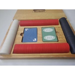 Marlboro Poker Chip Set 2 Card Decks & Chips Wood Oak Case Vintage Promo.