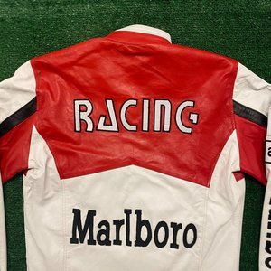 Red and white long sleeve full zip leather racing jacket by Marlboro with Marlboro Racing team graphic and Michelin, Alpinestars, Marlboro World Championship Team patches. YKK zippers for front, pockets, and sleeves. Adjustable at waist, two waist pockets with zip closure. Two interior pockets. The leather is very soft, and the jacket is surprisingly lightweight.