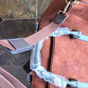 Fantastic Vintage condition with tags. This is a vintage Marlboro 2003 Guts Grit Gear brown suede leather duffle travel bag. It features brass hardware, a zipper closure, adjustable straps, and a nylon lining.