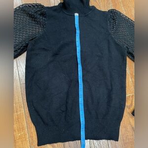 Chic black turtleneck sweater. Features stylish sheer sleeves. Perfect for a modern look.