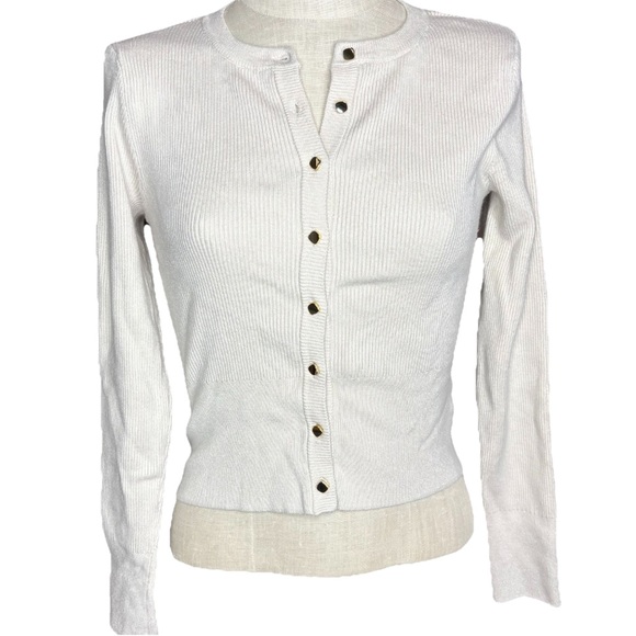Marled cream fitted ribbed gold button cardigan sweater. Stretchy material. Great condition, size medium.