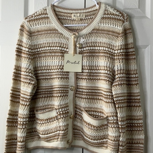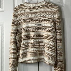 Marled Cream and Brown Striped Knit Cardigan with Front Pockets Size L