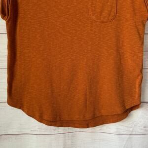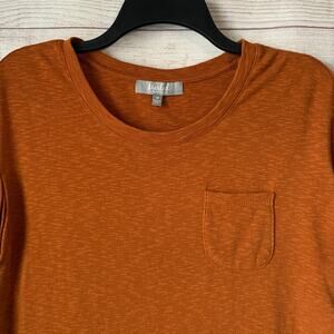 Burnt orange or rust t shirt by Marled Essentials. This shirt has a rounded, slightly scooped neckline, fixed rolled cuff short sleeves, a patch pocket on the front chest, and a rounded bottom hemline. It is pre-owned, with very light fuzziness or pilling in some spots, but is otherwise in great condition.