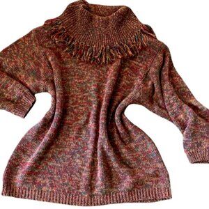 Description: VTG 80s/90s Cottagecore BOHO Drop Shoulder Pullover Tunic Sweater with Fringed Cowl Neck and Shoulder Pads.