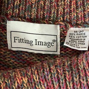 Elevate your wardrobe with this stunning multicolor knit tunic sweater from Fitting Image. The cowl neckline adds a touch of bohemian flair, while the fringe accents give it a playful touch. Perfect for casual or business occasions, this sweater features a straight hem and long sleeves for a comfortable and relaxed fit. Crafted from a ramie cotton blend, this tight-knit sweater is machine washable for easy care. The multicolor pattern and shoulder pads make this sweater a statement piece, perfect for the winter and fall seasons. This vintage-inspired tunic sweater comes in a plus size 18/20, and is ideal for those who love colorful, lagenlook, prairie, bohemian, cottagecore, and modesty themes.