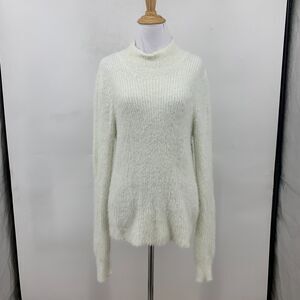 Marled Reunited Sweater Womens L Large White Fuzzy Knit Mock Neck Nylon Blend
