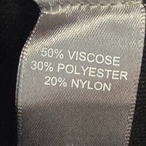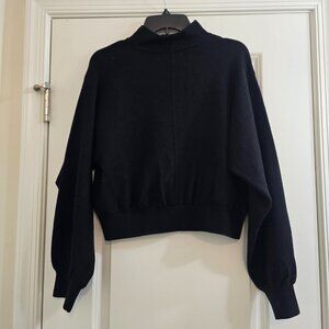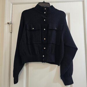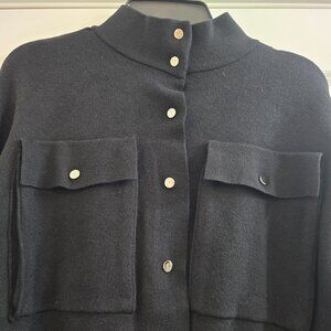 Classic black sweater jacket. Front pockets and buttons up front. Dropped shoulders with full sleeves. Polyester, viscose, and nylon fabric.