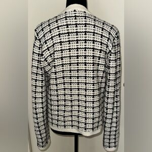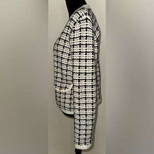 Slip into a classic look with this Marled Tweed Cardigan Sweater. The garment features a geometric pattern in cream and black, a V-neckline, and long raglan sleeves. Perfect for various occasions such as travel, party, cocktail, casual, and business, this cardigan is made of a blend of acrylic, cotton, polyester, spandex, and metallic materials, making it soft, comfortable, and durable. The sweater also has pockets and a collarless design, adding to its convenience and style. This size M cardigan is machine washable, making it easy to maintain its quality.