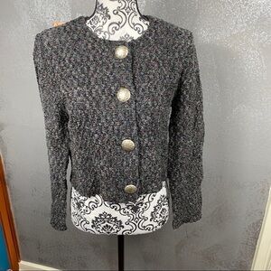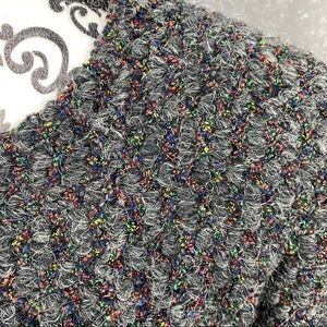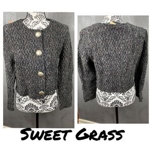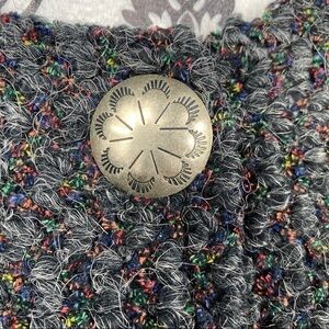 Sweet Grass leather brand tag. This sweater appears to handmade and/or upcycled sweater. It has multicolored fibers, a fairly soft touch. It has large ornate silver button closure. The materials tag has been hand corrected to 16% cotton 84% acrylic (probably from whoever upcycled). It’s a very unique piece.
