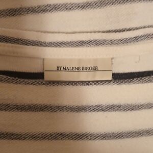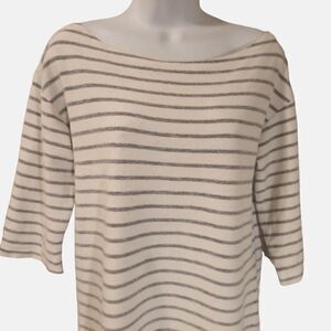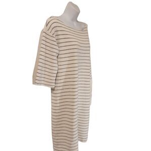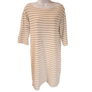 Cute casual comfy cream with black stripes, boat neck pullover tee shirt dress has 1/2 sleeves. Fabric is 100% cotton, feels like terry cloth size S measures 18" pit to pit 35" long in nice pre owned condition