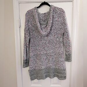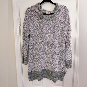 Cozy hooded tunic length sweater. Perfect to wear with jeans, leggings, heavy tights and boots. Approximately 28” from shoulder to hem.