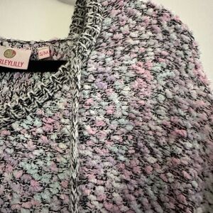 Hooded sweater of marked black, white, and pastel cotton candy colors.