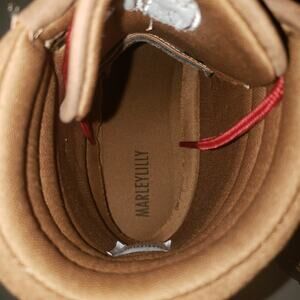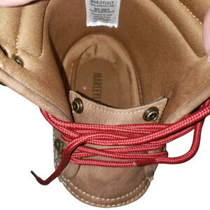 Never-worn Marleylilly duck boots are crafted in tan and brown faux leather with bold red laces, they’re finished with a custom CHJ monogram for a one‑of‑a‑kind touch. Designed with a removable snap‑out tongue, embossed logo heel, and rugged waterproof sole, they balance comfort with durability.