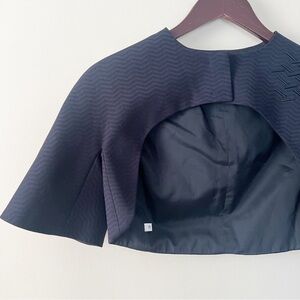 Brand new with tags. Navy blue zig zag print tailored shrug. Round open front. Luxury Italian brand. Short sleeves. Hidden Button closure. High round neck. Beaded appliqué on shoulder.