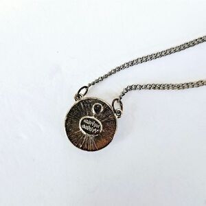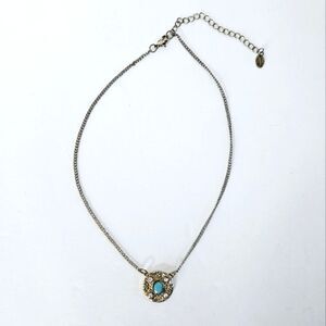 The perfect statement necklace to brighten up any look! Link necklace with lobster clasp and disc pendant design including 1 textured metal gold tone disc pendant accented with a turquoise pave stone and small icy clear crystals. This is in good condition without any missing stones but there is significant wear to the gold plating on the chain. Measures 16" long and can be adjusted up to 20".