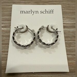 These Marlyn Schiff earrings feature a striking silver finish with a textured, notched design that adds a modern touch. The medium-sized hoops are crafted with a hinged closure for easy wear, offering a sophisticated play of light and shadow. Perfect for adding a touch of elegance to any ensemble.
