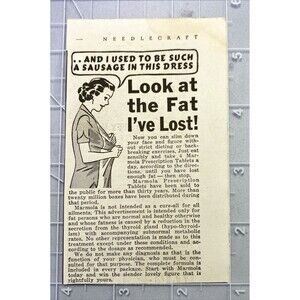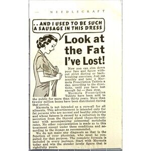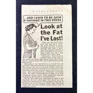 Marmola Prescription Tablets "Look at the Fat I've Lost!" Vintage Print Ad 1939 Needlecraft Magazine of Home Art April,1939 About 4.5 x 3 Inches. Carefully shipped.