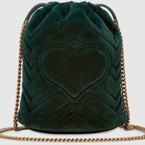 Marmont Interlocking GG Logo Mini Bucket Bag with Chain is crafted from chevron velvet in a deep shade of green. Inspired by an archival design from the '70s—a hallmark era of the House—the Double G decorates the front of this accessory. Featuring a chain strap and drawstring closure the versatile shape can also be worn as a cross body bag.