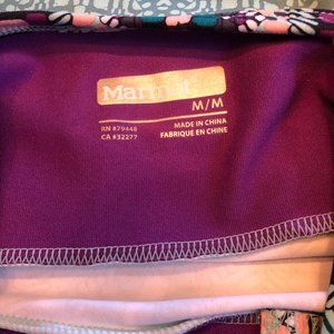 Stylish Marmot midi dress. Features vibrant purple top. Unique patterned green skirt. Perfect for any occasion.