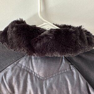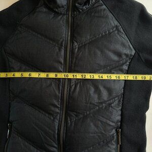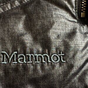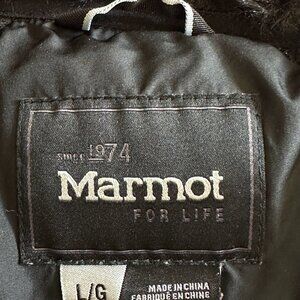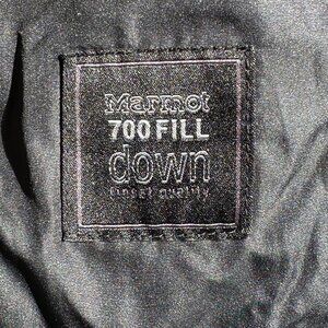 Cozy Marmot Women's Down Insulated 700 Fill Full Zip Fleece Puffer Black Jacket Size LARGE. The inside of the neck is a lovely, fuzzy material for extra warmth. This can be rolled down. The arms are a knit material. Pre-loved and in very good condition. Please check the photos for measurements.