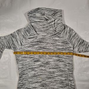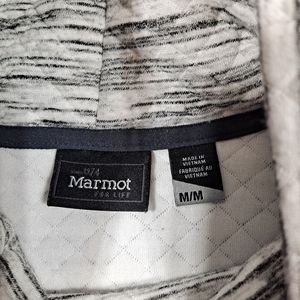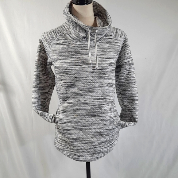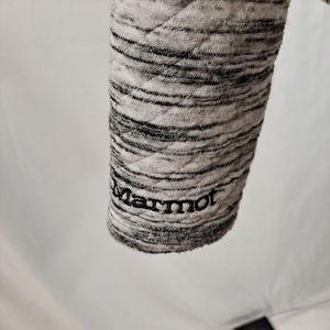 Marmot Grey And White Annie Quilted Pullover, Kangaroo Pocket, Adjustable Drawstring Cowl Neck, Long Sleeve, Thumb Holes, Scoop Hem, Great Used Condition, small amount of piling