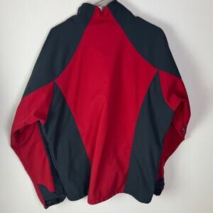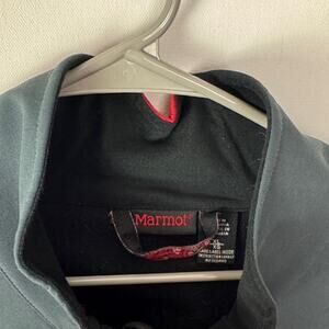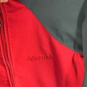 Gently Used Marmot Full Zip Soft Shell Jacket. This is a men's XL. Mostly red with gray accents on the sides and sleeves. Front zipper pockets. Marmot text logo on the chest. Fleece lined for some extra warmth. Shell is 50% nylon/polyamide, 50% spandex.