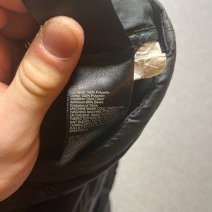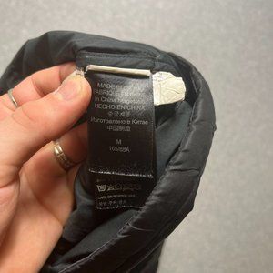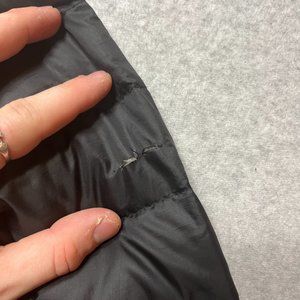 See all photos for measurements! Item is used and subject to wear, has minor flaws: one rip in the sleeve, it can easily be repaired and not much of the fill has left the jacket (I also threw a piece of tape over the rip so fill wont come out) and one more tiny hole - see all photos for details. Overall great shape.