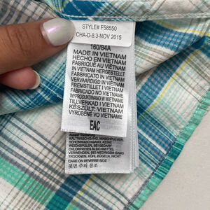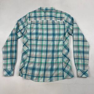 This Marmot button-up shirt in size S features multicolor plaid pattern, long roll tab sleeves, collared neckline, and button closure. It is made of polyester material and is machine washable for easy care. Perfect for any occasion, including travel, party, casual wear, and workwear.