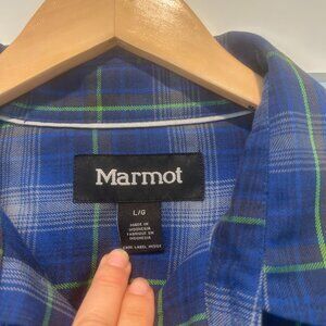 Marmot men’s long sleeve plaid shirt in size Large, style SCC-183. Features a classic blue and green plaid pattern, full button front, collared neckline, and dual chest pockets with button flaps. Lightweight yet durable fabric makes it a versatile layer for outdoor adventures, casual wear, or travel.