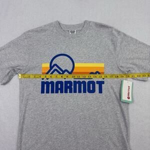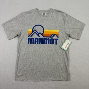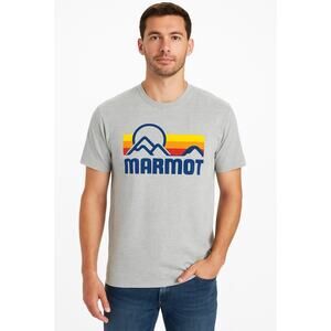 marmot t shirt coastal tee retro logo graphic outdoor hiking camping climbing trail casual small grey heather short sleeve men’s apparel new with tags NWT S24 mountain works