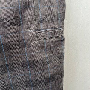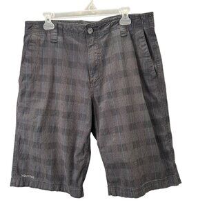 Marmot shorts in charcoal gray, blue and black plaid. Zipper fly, flat front, longer length, small cargo pocket on lower leg, good condition. Size 36.