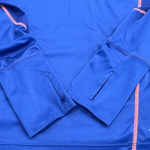 Great condition- no holes or stains. Marmot Polar Tec Baselayer Quarter Zip Longsleeve with thumb holes. Blue with pink trim. One zipper pocket on the back that would hold earbuds.