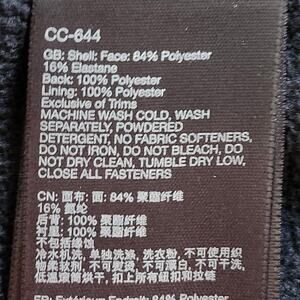 Features: zippered hand pockets, zippered chest pocket, internal zip pocket, elastic drawcord hem, angel-wing movement