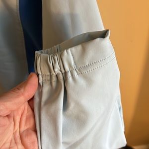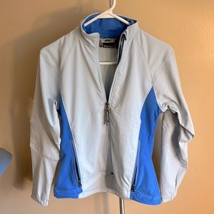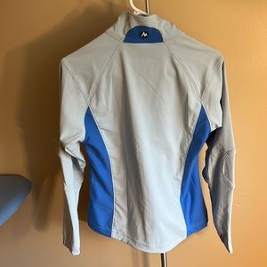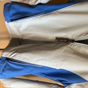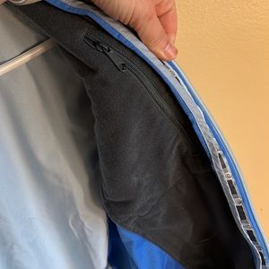 Royal and pale blue shell. Two outer pockets, one hidden inside. Chest lining is fleece. EUC!