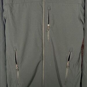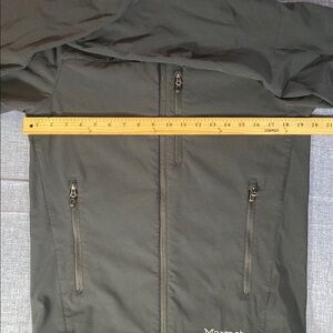 Lightweight and durable black softshell jacket by Marmot, size small. Features full front zip, zippered chest pocket, zippered hand pockets, adjustable hem, and interior stretch comfort. Perfect for layering during hikes, travel, or everyday wear. Its also stretchy.
