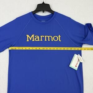 Marmot shirt trail blue graphic tee outdoor hiking climbing camping activewear sustainable recycled polyester lightweight stretch breathable quick dry adventure performance logo top NWT