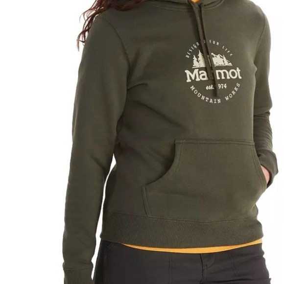 Olive green hoodie with front pocket. Features Marmot logo. Ideal for casual wear. NWT