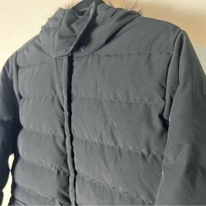 Features: attached hood with faux fur trim, 700 fill power down insulation, six functional pockets, magnetic closure on flap pockets, fleece lined cuffs, lightweight warmth