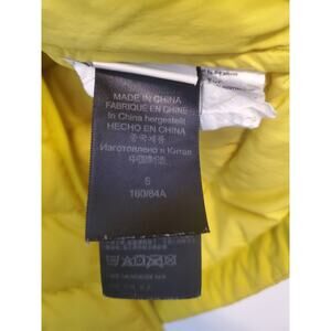 Lightweight yellow puffer jacket. Full zip closure. Embroidered Marmot logo.