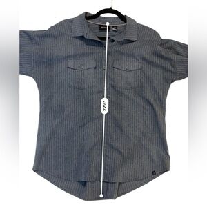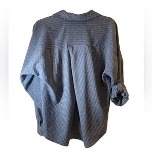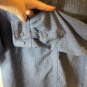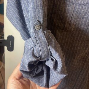 a lightweight, long-sleeved shirt designed for outdoor activities, made from breathable, moisture-wicking fabric with UPF 30 sun protection. The shirt features a half-button design for ventilation and two chest pockets. A dark blue color with a subtle vertical stripe pattern. The sleeves can be rolled up and secured with button tabs. Excellent used condition