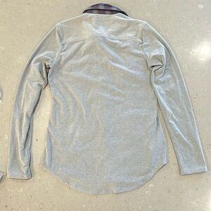 Dark purple and blue plaid on collar and front with two breast pockets. Solid gray on back, sleeves, and sides.