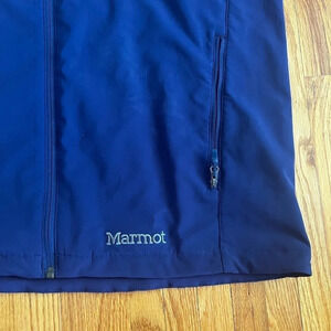Marmot fleece lined rain jacket, size Large. Navy blue color with two embroidered logos- one o the chest and another on the back center. Has 3 zippered pockets , in excellent condition.