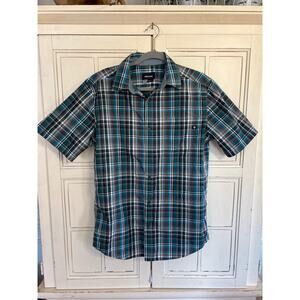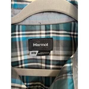 Marmot size medium mens plaid button down shirt in excellent condition. Gray, black, white and teal. Measures 22 1/2” from armpit to armpit and 29” long.