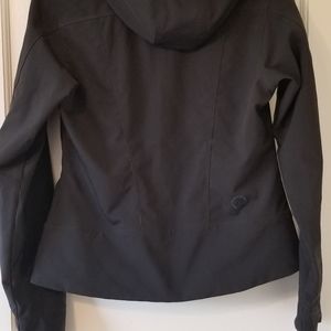 Black Marmot lightweight softshell jacket. Has a hood, two zippered pockets and zippered sleeves. Great for spring!