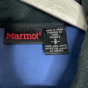 Marmot blue fleece jacket in size small for women. No flaws. Zips up front, has pockets. Unlined. Polyester, machine wash.