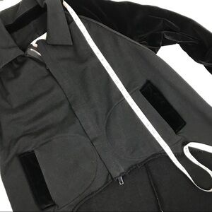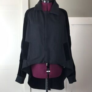 Los Angeles designer piece! Marna Ro black jacket zip front hi lo hem XS. This LA designer makes unique and edgy pieces. This one you can have at a fraction of the retail cost. Zipper front velvet sleeves and tuxedo like tails. A very original look. See photos for measurements. EUC non smoking home.