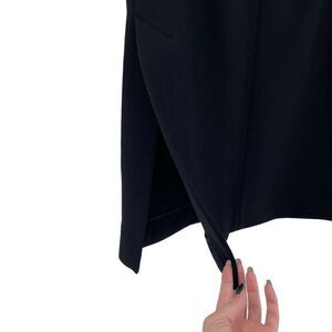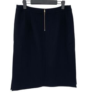 Hits just below the knee. Exposed back zip closure. Has side slits on both sides.
