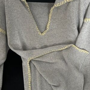 Beautiful Spring Sunmer 2024 Marni women's (or men’s) cashmere and wool off-the-shoulder sweater in light gray. Yellow hand embroidered stitching, Marni logo at the back from one of Francesco Risso’s last collections for the brand. This retailed for $1,350 at MyTheresa or Net-A-Porter