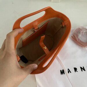 Perfect for the warmer seasons, this Marni coral mini bag embodies spring/summer freshness. It’s woven material and bright color are ideal for adding a cheerful note to your seasonal outfits. A delightful Marni accessory.